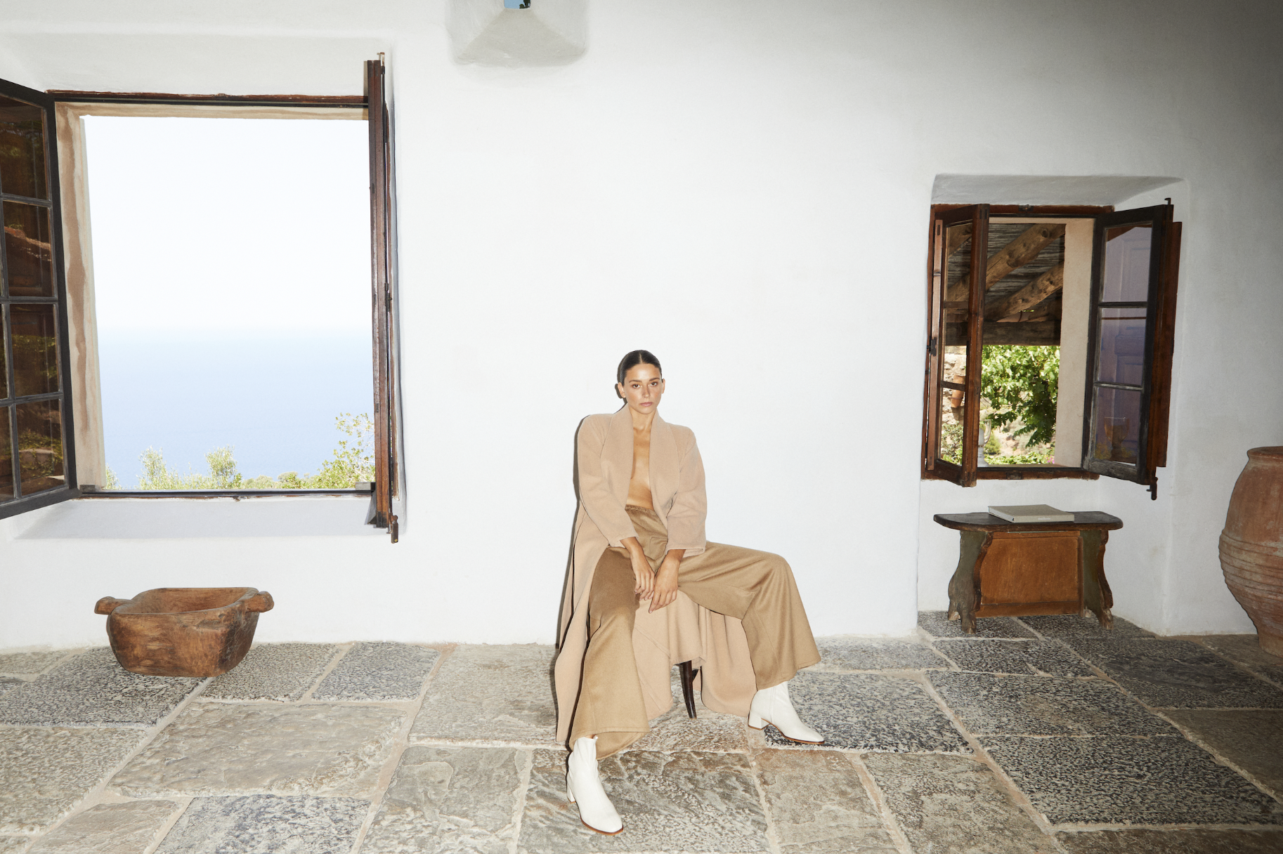 A woman in beige clothing and white boots sitting on a black stool inside a room with white walls, stone tile flooring, open windows showing green trees and a blue sky.